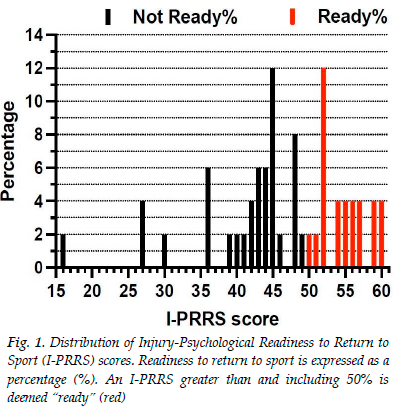 The most common scores were 45 and 52, accounting for 7% of the scores. According to their scores, 30 athletes were grouped as 'not ready' (60%), and 20 athletes were grouped as 'ready' (40%). Figure 1 shows the percentages of the distribution of the scores on the I-PRRS questionnaire amongst the participants.