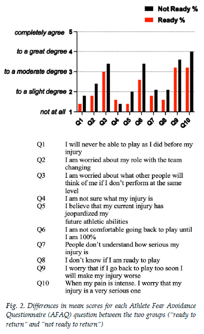 RESULTS: Fifty injured athletes with a mean age of 23.3±4.0 years old responded to the I-PRRS and the AFAQ questionnaires. The average I-PRRS score was 46.5±9.1 AU. The evidence suggests that 60% of the athletes were not ready to return to sport (41.0±7.5 AU), whereas 40% were ready to return (54.8±3.1 AU). The difference in scores was not significant. The relationship between the AFAQ scores and the I-PRRS score for the 'ready' and 'not ready' groups was not significant (p=0.066). The mean AFAQ score (26.1±8.6 AU) for the 'not ready' group is marginally greater than the mean AFAQ score (21.6±7.5 AU) for the 'ready' group. There was a negative correlation between psychological readiness to return to sport and athletic fear avoidance (r =-0.508, p<0.001