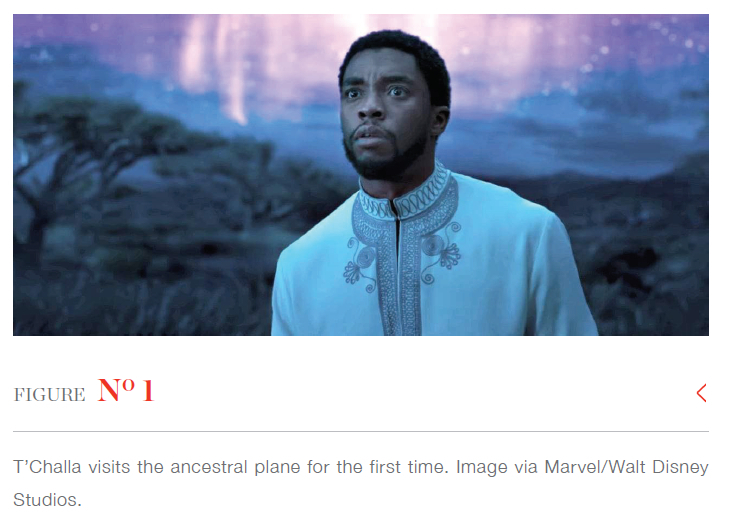 His father's untimely death provides the disruption that initiates T'Challa's personal growth. T'Challa endures this disruption and the ritual combat that it precipitates with confidence. However, he is troubled by the question of what kind of king he is to become. M'Baku, on challenging him, had confronted him with the changes that had taken place in Wakanda which he sees as under threat. M'Baku feels 'disgust': not only is 'tradition' threatened by 'technological advancements' (23:47), but T'Challa is an incapable leader, 'who could not even keep his own father safe [from being killed by Helmut Zemo]' (24:05). In an attempt to resolve M'Baku's troubling questions, T'Challa begs his father in the ancestral plane (Figure 1), 'Tell me how to best protect Wakanda' (32:27). T'Chaka offers him counsel, confident that he has prepared his son for the role he is to assume: 'Have I ever failed you?' (32:17) he asks. The irony of this question is only later revealed; for now, it suffices to soothe T'Challa, who, following his father's advice to surround himself with wise counsellors, talks to Nakia and W'Kabi about his role as leader and protector of Wakanda.