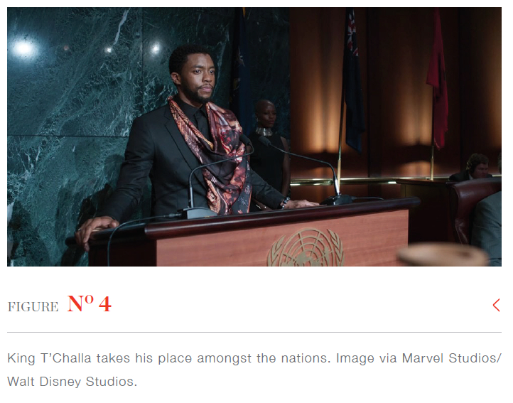 T'Challa's very different vision introduces a new equilibrium. It begins quietly in Oakland with a 'Wakandan International Outreach Center' (02:01:37), restitution for the harm caused by his father, but it is formally heralded when he addresses the United Nations General Assembly (Figure 4).