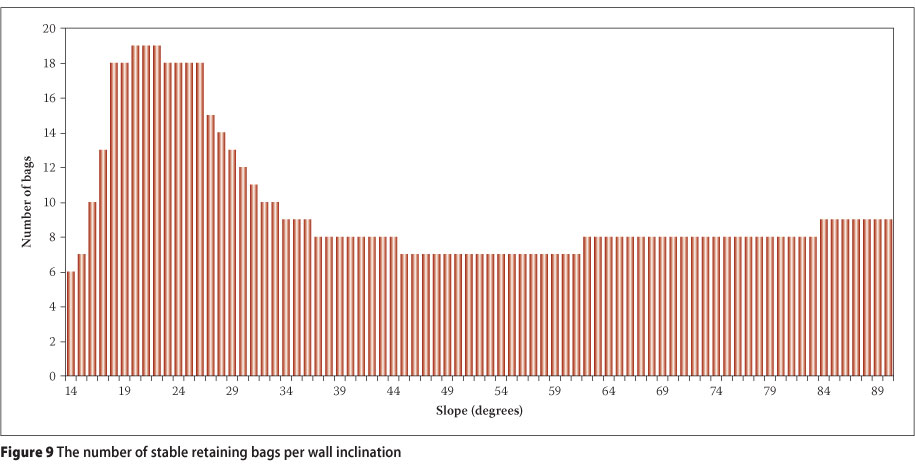 Figure 9 illustrates that the angle range of 18° - 26° can retain the most soil - the flatter the slope of the wall, the less the wave loading, but the greater the wave run-up. This simple calculation does not consider the hydraulic stability of the bags, and because the sand is displaced to the bags' front face by the lifting and dropping of the exposed portion, it is thought that the less bag length that can be lifted the more stable the bags would be. It is felt that the increased restriction of this movement is what makes the bags more stable at steeper slopes (Hornsey et al 2011) and not the increased friction.