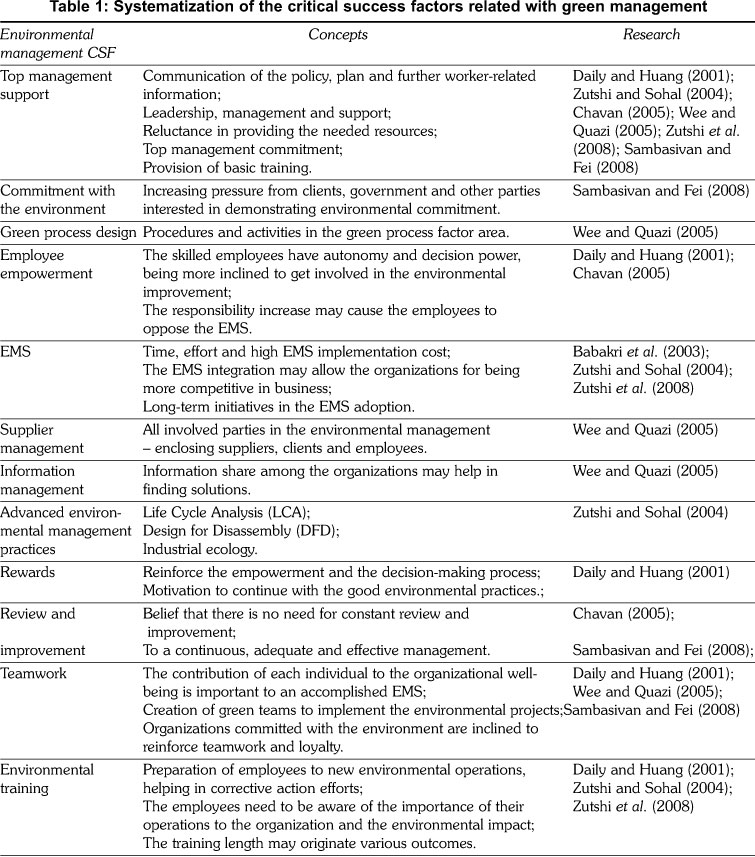 The literature review on green management critical success factors (Daily and Huang, 2001; Babakri et al., 2003; Zutshi and Sohal, 2004; Chavan, 2005; Wee and Quazi, 2005; Zutshi et al., 2008; Sambasivan and Fei, 2008) enabled the identification of the factors shown in Table 1.