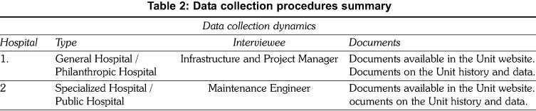 The data to this research comes from two hospitals in the state of São Paulo, Brazil. After the agreement, interview date and time, direct observation and document analysis for data was established. This phase took place in 2012, in Hospitals 1 and 2, according to Table 2.