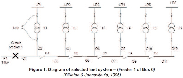 A suitable test was needed and the RBTS (Roy Billinton Test System) was selected. Although it is not a South African test system, its system components are similar to those of the South African power system. It contains all the major elements of a distribution system and its simplicity allows for analysis using simulation techniques. Other advantages of the RBTS include the fact that is best suited for educational purposes; it is used extensively in research and it is well defined. Feeder 1 (F1) of bus 6 of the RBTS was selected. It is shown in Figure 1 (Billinton & Jonnavithula, 1996). The feeder components include overhead lines (O1 to O12), MV/LV transformers (T1 to T6), disconnector switches (S1 to S5) and load points (LP1 to LP6).