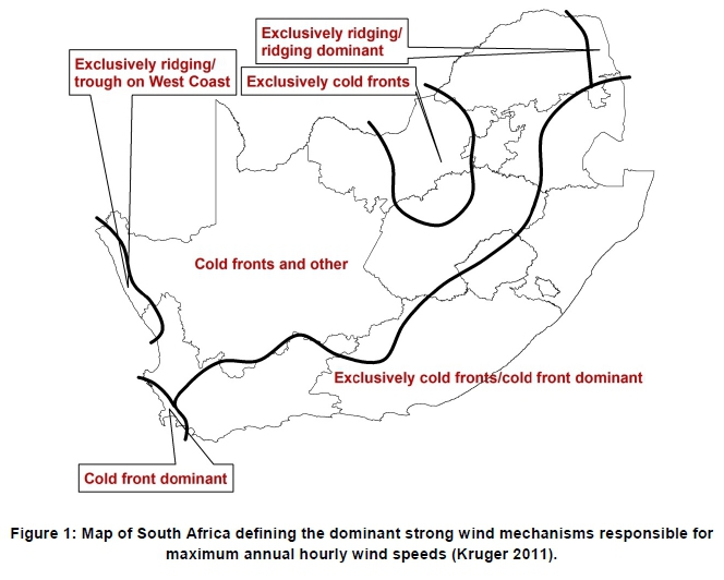 Electricity generated by wind turbines fluctuates with wind speed and wind speed varies at all timescales, from decades down to sub-seconds (Widén et al., 2015). At short timescales (less than one hour), these fluctuations are caused by turbulent eddies in the boundary layer, brought about by the interaction of meso-scale weather systems with the local environment. Short-term variability may be caused by local features such as terrain, surface roughness or micro-climatic phenomena such as sea-breezes. At longer timescales, of hours to several days, the most prominent variations are brought about by synoptic-scale weather systems (Kiviluoma et al., 2016). Amongst the most frequent of synoptic systems that affect South Africa's weather are extra-tropical cyclones, and the cold fronts associated with them. Little literature could be found where the underlying causative meteorological phenomena driving wind ramp events were studied (Couto et al., 2015; Gallego-castillo et al., 2015; Lacerda et al., 2017). Furthermore, attempts to find literature in which wind power ramp events associated with specific weather systems had been studied for South Africa were not successful. In the South African context, cold fronts are deemed highly relevant to the wind energy industry as they are the main strong wind producers along the coast and adjacent interior of South Africa (Kruger et al., 2010). Strong winds from the passage of cold fronts dominate the southern parts of the country, though these winds often reach further north, as shown in Figure 1.