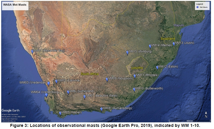 Wind power simulations were conducted for the passage of four cold fronts during August 2012, May 2013, and two consecutive events in July 2016 approximately two days apart. Wind speed and direction time series at four observational heights (20 m, 40 m, 60 m, 62 m), with a ten-minute temporal resolution, were obtained for fifteen WASA observational masts, represented by WM1-15 in Figure 3. The observational data, freely available from WASA (CSIR, 2010), was downloaded for periods corresponding to those of selected cold fronts making landfall in South Africa. The WM1-10 were installed during the WASA 1 project throughout 2010. The WM11-15 were installed during the WASA 2 project throughout 2015; therefore, the 2012 and 2013 simulations comprised data from ten observational masts. With the addition of WASA Phase 2 and the decommissioning of WM04 and WM08, the 2016 simulation consisted of data from 13 observational masts. Wind speeds were extrapolated from 62 m to the selected hub height of 80 m using Hellman's law, defined by Equation 1.