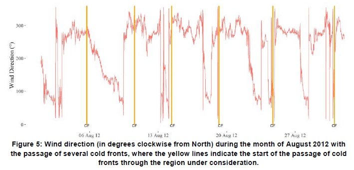 • a distinct change in wind direction, usually from the north-westerly sector to the south-westerly at WM05 (19.69245°E, 34.61192°S) (however, due to the orientation of some fronts not following the typical textbook examples this would not always be the case);