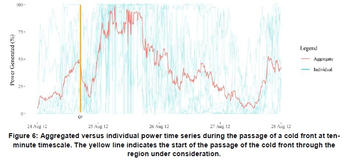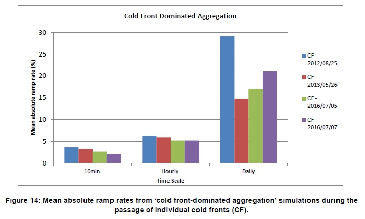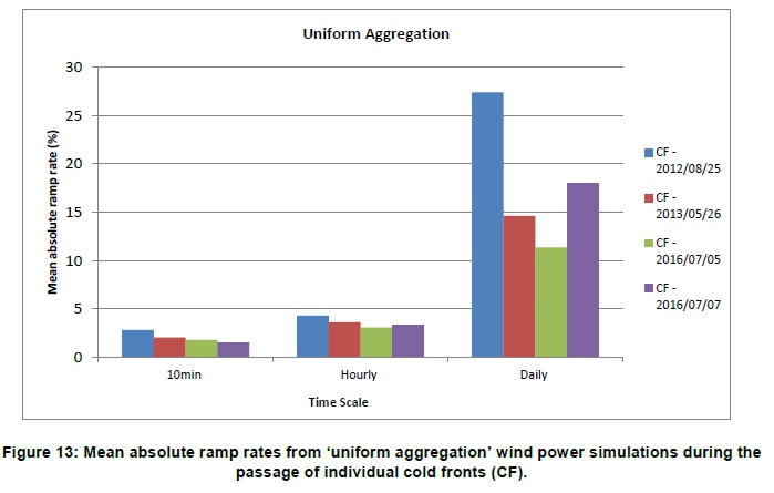 • The relatively small mean absolute ramp rate at the ten-minute timescale could result in a massive variation of total simulated capacity over the four-day simulation period (e.g. 5.4999.05% for the 25 August 2012 'uniform aggregation' simulation) with the passage of a cold front. This highlighted the importance of analysing wind power variability at longer timescales.