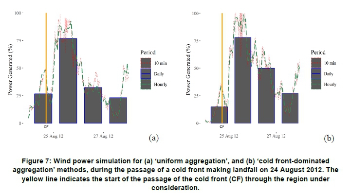 Figures 15-20 illustrate wind power simulations for the two geographic aggregation scenarios considered throughout this study, for the months of August 2012, May 2013 and July 2016, at ten-minute, hourly and daily timescales. Visual inspection shows that most of large spikes in wind power production, especially at the daily timescale, were preceded by a cold front making landfall in the Western Cape.
