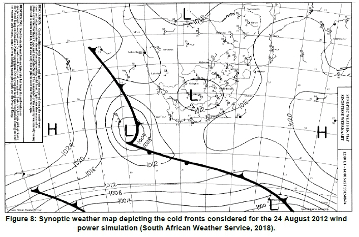 This is fairly similar to what was observed by Knorr et al. (2016) and it could be inferred that this line would become even smoother at the ten-minute timescale should more generators be added to the aggregate. Despite significant smoothing evident in the aggregated time series, a considerable degree of variability remained evident if considering the simulation in its entirety across four days. Figure 7 represents the two wind power simulations conducted for the cold front making landfall in the Western Cape on 22 August 2012 and should be read in conjunction with Figure 8, showing a synoptic weather map of this cold front. Figure 7 shows that a sharp and immediate ramp up in wind power generation, followed by a more gradual ramp down, was associated with the passage of the front.