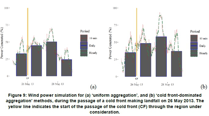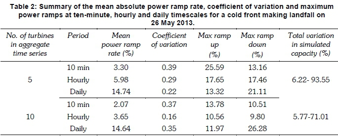 Figure 9 represents the two wind power simulations conducted for the cold front making landfall in the Western Cape on 26 May 2013. A synoptic weather map of this cold front is shown in Figure 10. The wind power variability in these simulations, expressed in terms of the mean absolute ramp rate, coefficient of variation and maximum ramp ups, is summarised in Table 2 at the ten-minute, hourly and daily timescales. Figure 9 shows a ramp up-ramp down pattern similar to that in Figure 7, although in this instance these ramps are relatively subdued, likely because of the differing intensities and tracks of the respective systems. Table 2 presents a wind power that is more variable in the 'cold front aggregation' than in the 'uniform aggregation' methods, which is also similar to what was observed in the previous simulation. Although the mean power ramps remained the largest at the longest timescale in Table 2, this was different for the coefficient of variation and max ramp ups, which was greater at the 10-minute timescale.