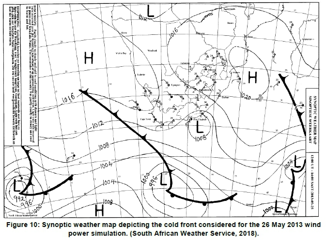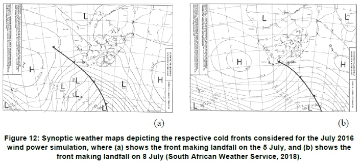 Simulations were conducted representing wind power generation during the passage of several cold fronts over South Africa. A cold front may somewhat simply be defined as the baroclinic boundary between a mass of cold air and warm air, where temperature decreases by a minimum of 3 °C (Eumetrain, 2012). There are no strict empirical definitions of a cold front, especially in terms of its significance, therefore, noteworthy historic cold fronts that had made landfall in South Africa were identified from news media reporting or from increases in observed wind speeds from Wind Atlas for South Africa (WASA) observational mast data (Council for Scientific and Industrial Research (CSIR), 2010; ECR Newswatch, 2016).