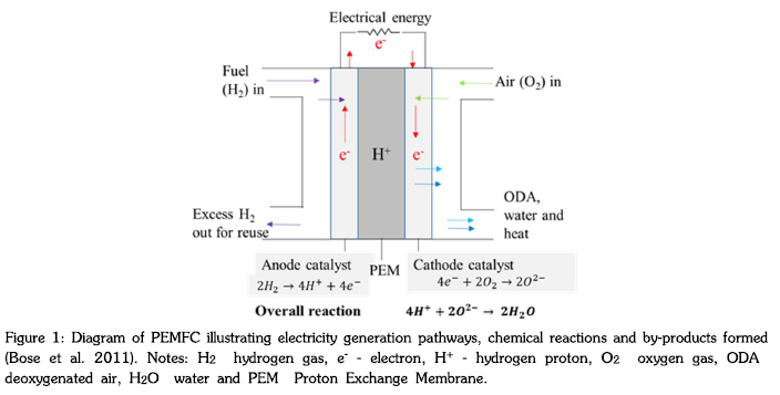 PEMFC shown in Error! Reference source not found, converts chemical energy from a catalyst-facilitated reaction of hydrogen and oxygen into electrical energy (Bose et al., 2011). Catalysts used in PEMFC are predominantly platinum group metals, more than 70% of the worlds platinum comes from South Africa. Hydrogen is the most abundant element on earth, but it is highly reactive so rarely found in its elemental form as H2, very light meaning it requires large spaces to store minimum quantities, and highly flammable making it dangerous to store and transport. The catalyst layer requires pure hydrogen as it is prone to poisoning by gases such as carbon monoxide/dioxide (CO/CO2) or sulphur (S) commonly found in hydrogen gases. Oxygen can be supplied to the PEMFC as pure O2 or as air from the environment in self-breathing cells (Bose et al., 2011). There are two simultaneous chemical reactions taking place in PEMFC, as shown in Error! Reference source not found., one at the anode catalyst where hydrogen (H2) is oxidized into hydrogen proton (H+) to release electrons (e") and the other at the cathode side where the oxygen (O2) is reduced by the electron from hydrogen into oxide ion (02") (Bose et al., 2011, Xiong et al., 2021). The flow of electrons from the anode to the cathode is resulting in electrical energy while the reaction between the oxide ion and the hydrogen proton from water (H2O). The overall reaction is exothermic, therefore releases heat (Xiong et al., 2021).