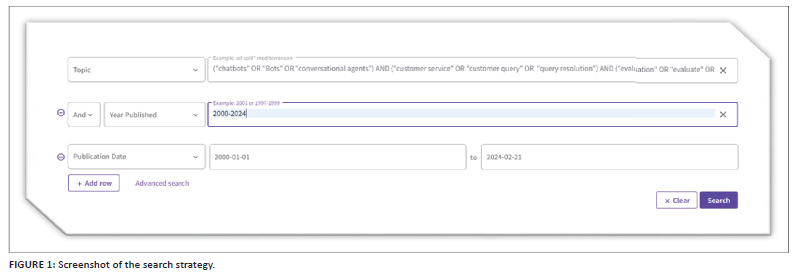 The search strategy employed Boolean operators to combine keywords and refine search queries, aiming to retrieve publications that specifically evaluated chatbots' effectiveness in customer query resolution. The search string ('chatbots' OR 'conversational agents') AND ('customer service' OR 'customer query' OR 'query resolution') AND ('evaluation' OR 'evaluate' OR 'assess' OR 'assessment') was designed to capture relevant literature while minimising the risk of overlooking pertinent studies. By restricting the publication year range to 2000-2024, the analysis encompasses the evolution of research trends and recent advancements in chatbot technology and customer service practices, providing insights into current research trends.