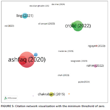 The significance of this analysis lies in its ability to uncover the interplay between cited documents to reveal patterns of influence and connections within the literature (Naveen et al. 2021:288). This analysis indicates that, while a substantial amount of literature was cited, only a few were extensively interlinked. These results suggest a fragmented landscape of research.