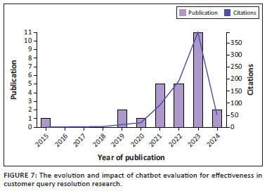 The analysis highlighted a notable trend of growing interest and relevance in chatbot research, particularly with a focus on addressing customer queries, their approach to resolving these queries, and the evaluation of their performance. The number of citations accumulated over the years emphasises the increasing recognition of chatbots as a viable solution for enhancing customer service and satisfaction across various industries. The observed increase in publications and citations (Figure 7) reflects a broader acknowledgement of the potential benefits offered by chatbots in improving customer service efficiency and effectiveness. The analysis of increased publication and citation rates addresses RQ1: 'What is the current state of research on chatbot evaluation for its effectiveness in resolving customer queries?' by demonstrating the expanding academic attention given to chatbot effectiveness and query resolution.