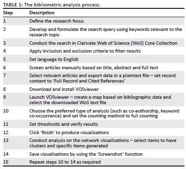 The steps followed in conducting the bibliometric analysis are summarised in Table 1 to enhance transparency and ensure reproducibility of the study.