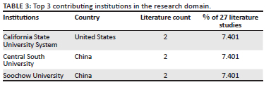 The analysis of literature contributions by author affiliations indicates participation from several institutions. The California State University System, Central South University, and Soochow University emerge as prominent contributors, each with two "participation" works (Table 3). Additionally, 62 other institutions have made singular contributions. The presence of multiple institutions suggests a degree of robustness and diversity in the academic research institutions and indicates a broad engagement with the research domain across different academic settings and geographical regions. However, the predominance of single contributions from many institutions may suggest a lack of concentrated research efforts and collaboration. This indicates potential opportunities for increased collaboration and synergy among institutions to foster deeper exploration and advancement of research in the domain.