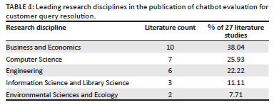Business and Economics emerged as the dominant research discipline for chatbot evaluation in resolving customer queries. This prominence reflects the growing significance of chatbots as integral tools for enhancing customer service within commercial contexts. The prevalence of research in Business and Economics emphasises the strategic importance of chatbots in driving business innovation and improving customer experiences. Customer service organisations are increasingly turning to chatbots as a means to streamline customer query resolution processes and improve overall customer experiences, resulting in greater customer loyalty and ultimately a stronger competitive position in within their respective industries. (Miklosik et al. 2021:106535; Misischia, Poecze & Strauss 2022:423). These findings address RQ2: 'Which research disciplines predominantly contribute to the literature on chatbot evaluation in resolving customer queries?' by identifying Business and Economics as the most active discipline in chatbot evaluation literature.