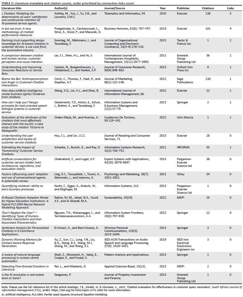 Furthermore, a bibliometric analysis enables the researcher to understand the state of research in the domain of study and identify research gaps (Aria & Cuccurullo 2017:959). In this study, bibliometric analysis provides a robust framework for investigating the body of literature related to chatbot evaluation and its effectiveness in resolving customer queries. By analysing bibliographic data extracted from publications, this methodology facilitates the identification of key trends, influential works and research gaps in the domain, contributing to a deeper understanding of chatbot adoption in customer service.