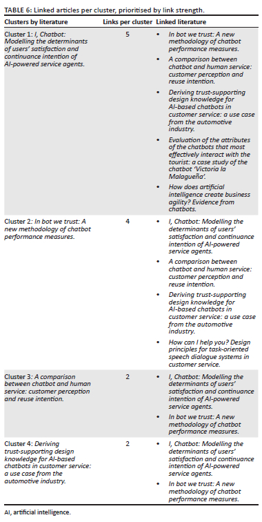 From a dataset comprising 212 keywords extracted from relevant literature, the keyword co-occurrence analysis conducted with a minimum threshold of five occurrences yielded eight unique keywords. Five was the minimum occurrence threshold, as keyword occurrences below five were deemed not value-adding based on the aim of the analysis. Seven of the eight unique keywords that emerged through the analysis were selected for visualisation (Figure 4). These keywords include 'chatbot', 'chatbots', 'customer service', 'satisfaction', 'quality', 'anthropomorphism', and 'artificial intelligence'. Notably, 'technology' was the eighth keyword deliberately excluded from the analysis because of its broad and overarching nature, which lacks specificity to the research focus. The resulting network visualisation revealed two distinct clusters comprising 20 links with a total link strength of 64.