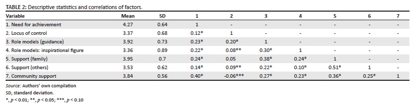 Factor analyses 2 and 3 were run to determine if need for achievement and family support each represented a single construct. The Kaiser-Meyer-Olkin Measure of Sampling Adequacy (0.641 for need for achievement and 0.806 for family support) and the Bartlett's Test of Sphericity being significant (p = 0.000) both indicated that a factor analysis was appropriate. With regards to need for achievement, the factor analysis confirmed the existence of a single construct. As for family support, the factor analysis revealed the existence of two constructs, after rotating the factor loadings using the Oblimin with Kaiser Method (final factor loadings are reported in Table 1). The original family support construct turned out to represent two sub-constructs, namely, support from members of one's close family and support from other people, such as friends, neighbours and acquaintances. These two sub-constructs are referred to as 'support (family)' and 'support (others)' in the rest of the article.