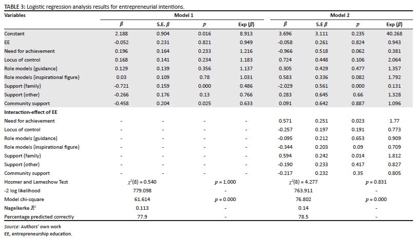 Concerning the hypothesised positive influence of EC on EI, the hierarchical logistic regression analysis revealed that students who exhibited support from their close family and support from the community at large are twice and one-and-a-half times less likely, respectively, to have EI. It can be assumed that learners will leverage the support they find from their close family and within their community to find formal employment or a similar risk-averse career solution. Given that most youth entrepreneurship happens in the form of necessity entrepreneurship in South Africa (Kew et al. 2013:42), this finding is not surprising. Moreover, these results are analogous to those of other scholars surveying secondary students and investigating similar constructs, such as Marques et al. (2012), who observed a negative influence of family entrepreneurial background and subjective norm on EI. Similarly to what has been observed about EE above, these results indicate that EC are not sufficient for secondary students to develop EI.