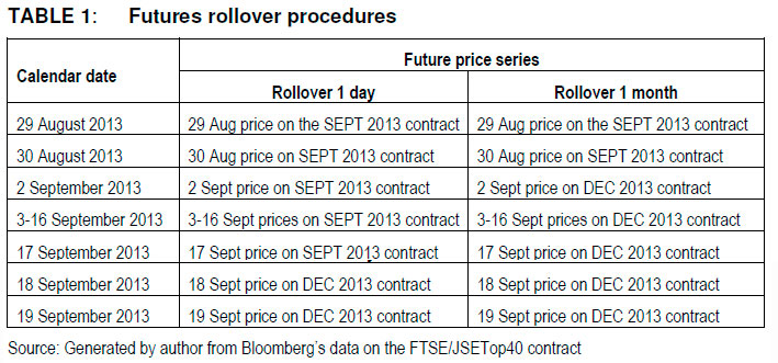 The 7-day, 10-day, 1-month suggestions are not as divergent as they appear to be, as they usually refer to number of trading days. Futures contracts on the FTSE/JSE Top40 expire on the third Thursday of the maturity month. Using September 2013 as an example, if the day of contract expiry (19th Sept) is included, this represents a rollover on the 11th Sept (7-day rollover), 6th Sept (10-day rollover) or 30th August (1-Month2 rollover). The 'how-to' of rolling over is straightforward; however, it is not clear which rollover strategy is the best to use.