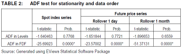 Results for the ADF tests, run with trend and intercept applied, are displayed in Table 2, with statistical significance indicated with *. The Top40 Index, the Futures 1-Day and Futures 1-Month Series showed the presence of a unit root in level (log) form. In all cases the series became stationary in FDF, indicating series are integrated of order I(1). Conclusions were unaffected by the type of ADF test run (with or without intercept and/or trend), or by the number of lags included.