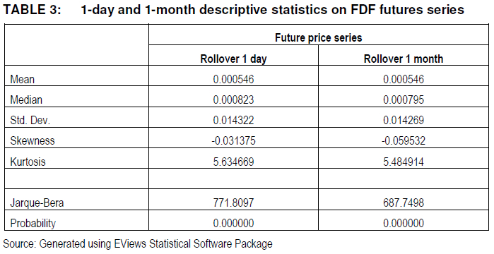 The Futures 1-Day and Futures 1-Month Series were then examined in FDF in order to comment on the descriptive statistics for these two series constructed with different rollover procedures. Results are shown in Table 3.