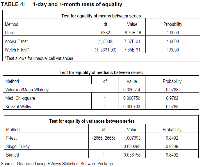 That is, the use of the 'smoother' 1-Month series shows fewer statistically significant price movements than the 1-Day VECM. While the overall findings are the same in both, the specific details differ, despite equality in mean, median and variance. This may be attributed to the fact that equality tests examine a single variable at a time. That is, this 'equality' does not take into account the correlation and covariance structure of the relationship between variables. As the VECM specifically examines the relationship, it is not unsurprising that different results are obtained.