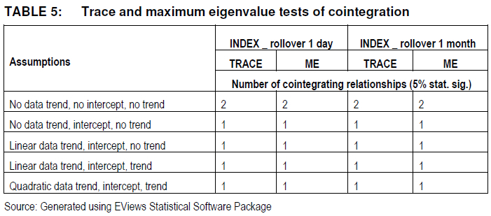 The next stage involves establishing whether the spot and futures series have a long-run cointegrating relationship. This is determined through the use of the Trace and Maximum Eigenvalue (ME) Tests associated with Johansen's Cointegration methods. These tests are run twice: once with the index against the 1-day rollover3, and again with the index against the 1-month rollover4.