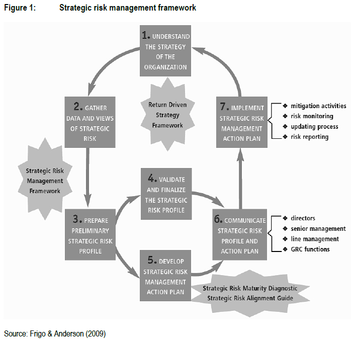 Strategic risk has been listed as one of the four risk categories and, as defined in the research agenda review, involves risks that could affect the organisation in achieving its objectives and strategy. Thus the management of strategic risks is part of the overall ERM process -although, in its management, it can follow a specific management process as shown in the framework proposed by Frigo and Anderson (2009) in Figure 1.