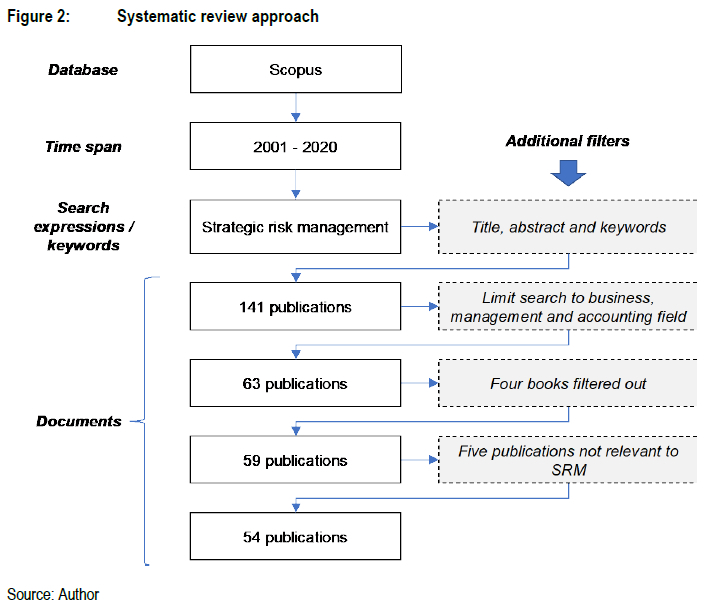 DESIGN/METHODOLOGY/APPROACH: A systematic review of the existing literature on SRM was conducted, and relevant publications were selected from a Scopus search for the period 2001 to 2020. The selected publications contained 'strategic risk management' in their title, abstract, and/or keywords. The initial search produced 141 publications; this was filtered further by refining the search criteria and, after further manual filtering, 54 publications were finally identified for this study