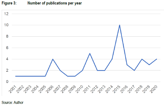 The average number of papers published in the second decade (2011 to 2020) increased from 1.5 per year in the first decade (2001 to 2010) to three per year. This means that the number of published papers doubled in the second decade.
