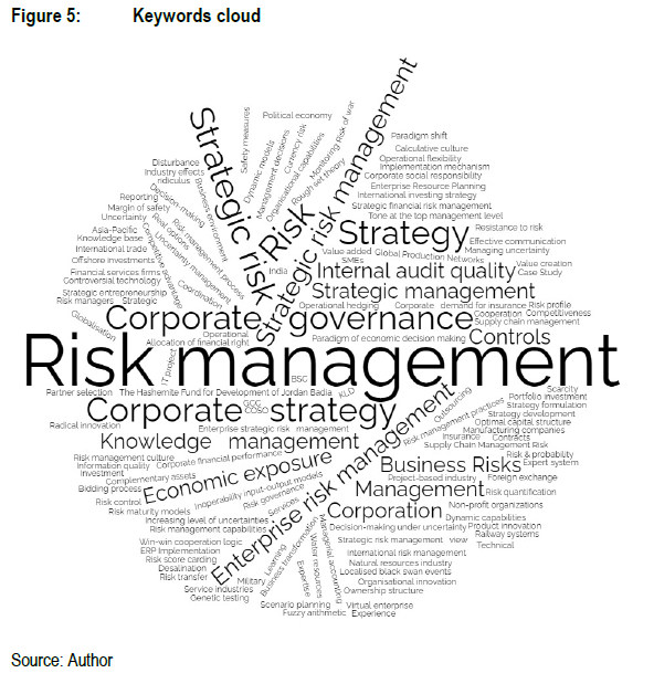 In the keyword cloud (Figure 5), risk management, strategic risk management, enterprise risk management, enterprise strategic risk management, international risk management, risk management capabilities, risk management culture, risk management practices, and risk management process were all merged under 'risk management'. This was done to reduce the number of keywords so that the keyword cloud was not cluttered. The keywords in Figure 5 show that the larger the word, the more often it occurs.
