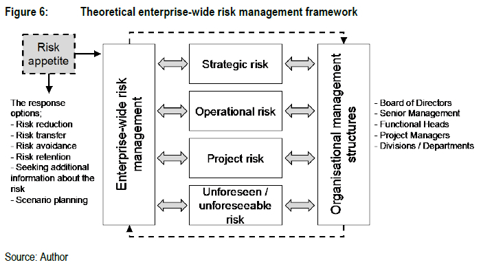 The determination and assessment of the organisation's risk appetite is important in the overall ERM process, as shown in the proposed theoretical enterprise-wide risk management framework (Figure 6). If the risk appetite is not determined well as it relates to the strategic risks, it could have a wider implication and impact on the management of the other risk category levels such as operational risk, project risk, and unforeseen/unforeseeable risk.