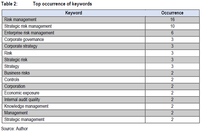 The results in Table 2 show that the most frequently occurring keywords were risk management (16 times) and strategic risk management (10 times). Note the other keywords that do not contain the word 'risk', such as 'corporate governance', 'corporate strategy', 'strategy', 'controls', 'economic exposure', 'internal audit quality', 'management', and 'strategic management': this shows how the function of SRM is important in the management and oversight of the organisation. This also highlights the other management oversight functions that are influenced by, or that are supposed to take into account, the impact of SRM - for example, defining the organisation's strategy and the associated management, which would include corporate governance, controls, internal audit quality, and assessing and managing the economic exposure of the organisation.