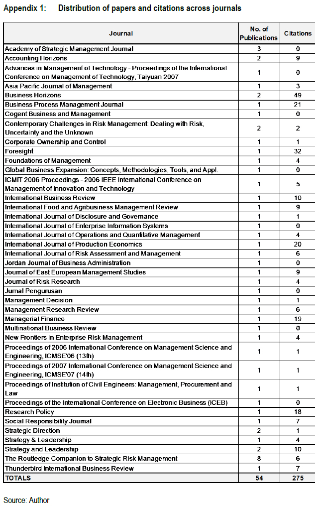 This review contributes to the body of knowledge by (i) presenting a review of SRM research over the two decades identified earlier, and (ii) providing a theoretical framework that can be used to guide the categorisation and identification of risks as well as (iii) the positioning of strategic risk with the other risk categories.