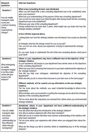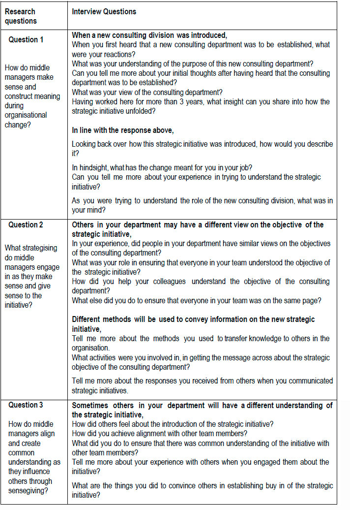 We structured our research project within a single case study to address our curiosity and gather rich data. In agreement with Yin (2016) and Creswell and Creswell (2018), single case studies allow researchers to collect valuable data through interviews. The single case study allowed us to directly engage individual middle managers face-to-face at their place of work in one of the leading financial services providers within the employee benefits environment in South Africa. Through our interview questions, we aimed to identify and describe the messy realities and lived experiences affecting middle managers' sensemaking and sensegiving when introducing organisational change.