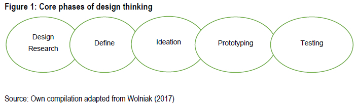 Design thinking reflects on why the end-user is experiencing a problem, what can be done to address this, and how this solution can be realised (Thomas & McDonagh, 2013). This is enacted through empathetically engaging with end users during the design research, defining the problem, generating ideas, prototyping and testing the solution, as depicted in Figure 1. Design research is one of the main techniques used for end-user research in order to identify obstacles the end-users experience in their environment (Wolniak, 2017). The define phase has a core focus on synthesising and interpreting information that is turned into insights (Liebenberg, 2020). The purpose of the ideation phase is to generate as many creative ideas as possible by reflecting on insights from the problem space (Wolniak, 2017). A prototype is a physical representation of the solution and serves as a visual for fast feedback on its effectiveness (Wolniak, 2017) and for transforming it (Beckman, 2020). Testing involves reconstructing meanings derived from previous situations in order to inform improvements for future design activities (Stompff et al., 2016).