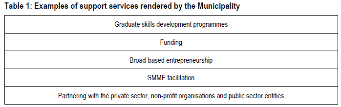 Participants highlighted areas such as research, social upliftment, industry support and job creation as some of the key function areas for economic development and where most of their work activities were based. Participants viewed one of the main roles of the Economic Development Unit as being to create an enabling environment for businesses and citizens to thrive, specifically for job creation. The data revealed that some of the ways this was done were to partner with the private sector to create job opportunities, and the public sector also created numerous skills development programmes. The researcher used this as an opportunity to incorporate job creation into the design thinking workshop to experiment with using design thinking as a new approach to this problem. This was most relevant to SDG 8 for decent work and economic growth. Job creation addresses unemployment. With unemployment, the end users of potential innovations for this were unemployed people. These areas formed the basis of the design thinking workshop, where stories were drawn from unemployment, social upliftment, research and industry support to highlight the ability of design thinking as a strategic problem-solving mechanism can deliver multiple solutions that are different to the current ways of doing things with an inclination entirely towards policy, strategy and research. Participants highlighted that initiatives at the Municipality were largely influenced by policy, strategy and research; examples of support services are shown in Table 1.