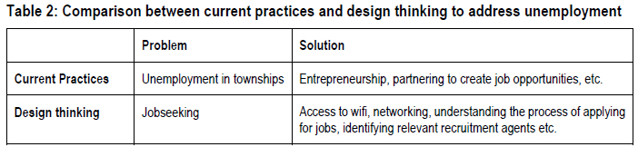 A social media post was used as one of the stories for the design thinking workshop. This depicted a young graduate, standing alongside a busy road, holding up a signboard with his credentials, trying to get the attention of relevant professionals who he probably knew would be driving that way at peak hour. The author of the post viewed this young man as someone from the township, cited unemployment in townships as a problem, and described how the solution of entrepreneurship was most appropriate to address this problem. One of the most common interventions for unemployment proposed by governments all over the world has been entrepreneurship, as shown in Table 1, with several research studies and programmes to promote the initiative. During the workshop, the researcher first discussed design thinking. Participants then looked at the social media post with a design-thinking mindset. The researcher explained that, at first glance, many would see unemployment in townships, but design thinking puts humans first. Thus, the design research entailed understanding the young graduate. Upon empathising with the young graduate, participants understood him as being a jobseeker and experiencing various challenges in this regard. Participants then followed the phases of design thinking and generated several ideas, such as understanding the process of applying for jobs. As shown in Table 2, design thinking shifts the problem to higher degrees of specificity where a whole new range of solutions can be developed.