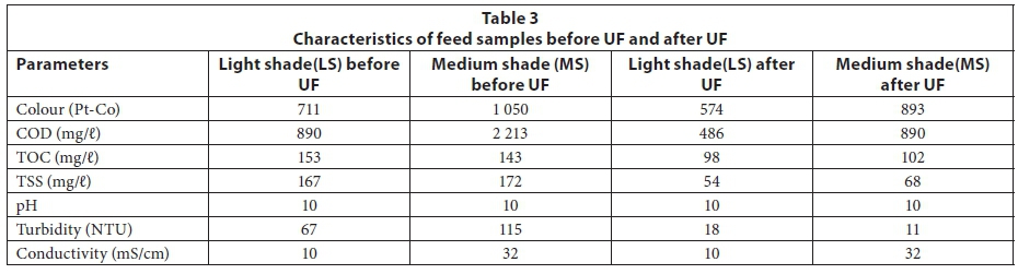 Table 3 reveals that the quality of the feed samples was different for the measured parameters. The medium shade had the highest organic load, colour and salinity. This is due to different dyeing recipes that are used in the textile. As a result of this, variation in wastewater quality is experienced.
