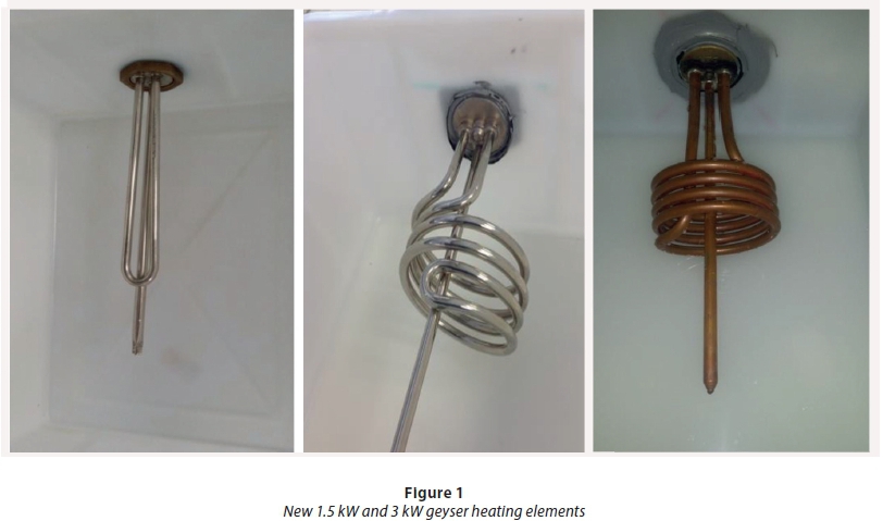 Geysers are pressurised vessels used to heat and supply hot water for domestic and industrial purposes. A thermostat is a component of a geyser used to control the temperature of the water being heated. The heating element turns on when the temperature of the water drops below the set point of the thermostat and will turn off to prevent the water from overheating. Residential geysers are usually equipped with a 1.5, 2, or 3 kW heating element in a 150 or 200 L water tank (Catherine et al., 2012). The materials of construction for heating elements include steel, stainless steel, aluminium, copper, fluoropolymer, brass, iron, nickel alloy, and polyimide (Gouws and Le Roux, 2012). Arunchala (2011) indicated that the performance of a geyser may deteriorate within 5 to 12 years of its installation. Performance deterioration factors may include the manufacture of the geyser, operating conditions, water quality, and inadequate maintenance (Arunchala, 2011).