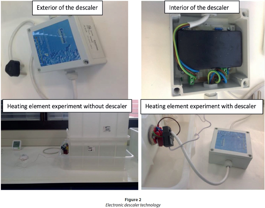 Electronic descaler technology is an inexpensive technology that can be applied externally to water system pipes for treatment of scale formation. The treatment is achieved by connecting the descaler technology to the water heater bucket with the heating element being tested. This technology does not require cutting or plumbing of pipework. The descaler technology produces a frequency-modulated waveform. On application of these frequencies, an oscillating electric field is generated in the water, which agitates the water molecules. This ultimately triggers carbon dioxide (CO2) release, resulting in premature precipitation of calcium bicarbonate. Figure 2 shows the exterior and interior of the electronic descaler technology, as well the heating element experiment, with and without the descaler. The electronic descaler technology experiments, indicating the type of heating element and experimental conditions, are shown in Table 8.