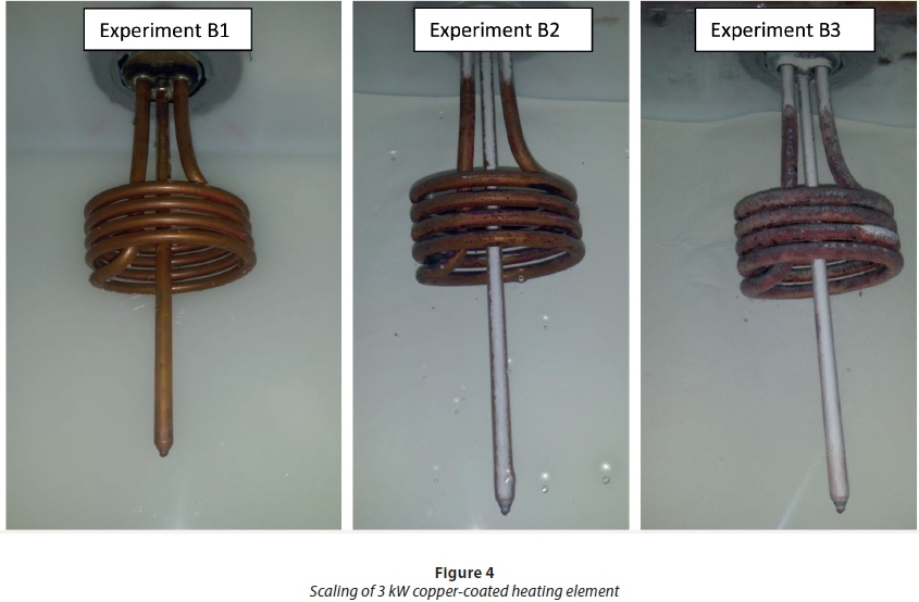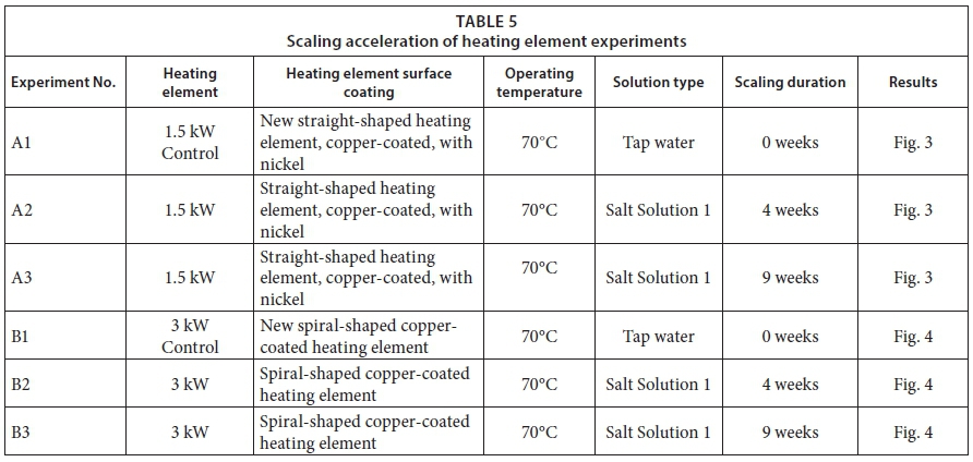 The electrical geyser heating elements were exposed to prepared salt solutions in 20 L buckets. The geyser heating element thermostats were set to 70°C instead of the normal geyser heating element temperature of 50°C or 65°C. The increased temperature accelerated the scaling process, as the higher temperature caused calcium carbonate to precipitate out of the solution and produce scale in the water heaters (Widder and Baechler, 2013). The accelerated scaling experiments ran for at least 2 to 3 months. Scale deposit formation of the geyser heating elements being tested and inspected was photographed before testing and during the 2 to 3 months of the scaling period. Accelerated scaling method experiments, indicating the type of heating element and experimental conditions, are shown in Table 5.