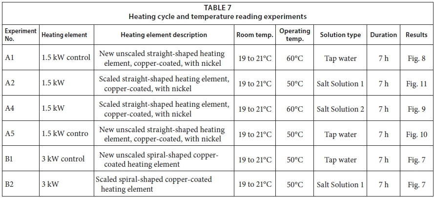 The energy consumption was measured for both new and trial geyser heating elements to monitor the power used during the experiments. Wireless electricity monitors were used in these experiments, mainly to monitor and display the power used by the geyser heating elements. In addition, these monitors were used to provide evidence of the overall time used for the scaling acceleration of each geyser heating element. Wireless electricity monitors were used as a troubleshooting mechanism to indicate whether the heating elements were, in fact, drawing power and were functional. These monitors showed the amount of power each geyser heating element consumed while running. Portable remote monitoring systems (PRMS) were also used to record the power consumption and temperature of the geyser heating elements while testing them. These PRMS were calibrated before being utilised. A PT100 resistance temperature detector ranging between 0°C and 100°C was installed in the data logger for temperature measurements of the geyser heater elements. The power consumption experiments, indicating the type of heating element and experimental conditions, are shown in Table 6.