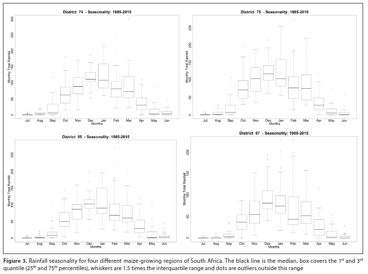 Long-term mean monthly rainfall totals were plotted to check the seasonality and rainfall variability for all selected districts from the summer rainfall region. The district rainfall plots exhibited austral summer rainfall seasonality with mean monthly rainfalls peaking in December. Examples of the plots are presented in Fig. 3, showing rainfall seasonality for 4 districts covering different maize-growing regions of the summer rainfall areas of South Africa.