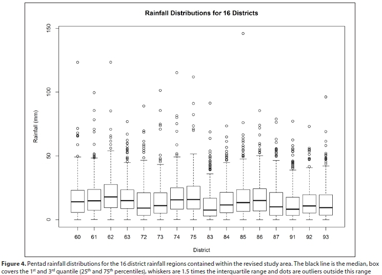 Pentad rainfall distributions for the 16 district rainfall regions contained within the study area are presented in Fig. 4. Pentad rainfall distributions are clearly skewed towards the higher rainfall totals. This is a common feature with sub-monthly rainfall totals (e.g. days and weeks, or in this case pentads). Rainfall totals for months and seasons tend to be less skewed compared to sub-monthly rainfall totals. This justifies the reason for defining dry periods with thresholds for the dry spell analysis.